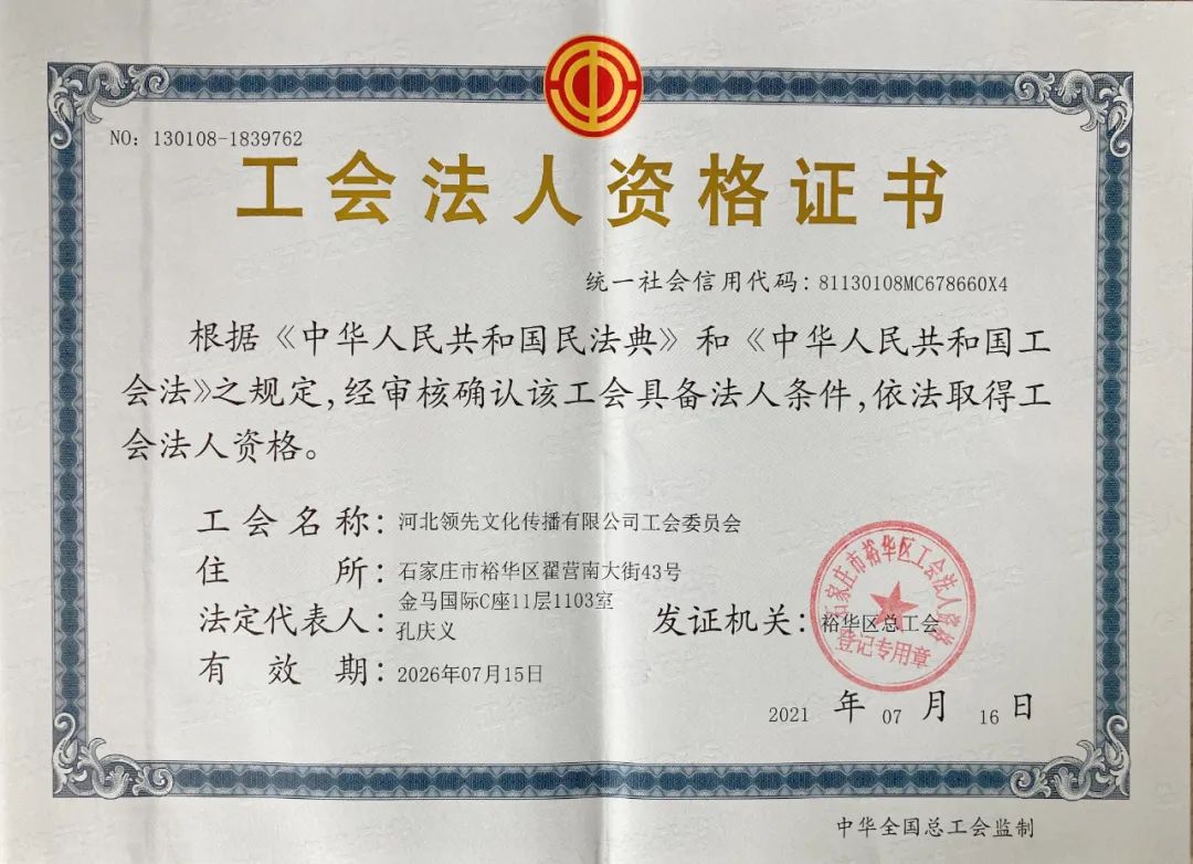 为更好地发挥工会组织在企业发展中的促进作用,充分发挥职工的责任感和使命感,加速实施公司发展规划,推进和谐企业建设,根据《中华人民共和国工会法》,经石家庄市裕华区总工会审批同意,河北领先文化传播有限公司组建工会委员会。查看详情>> -